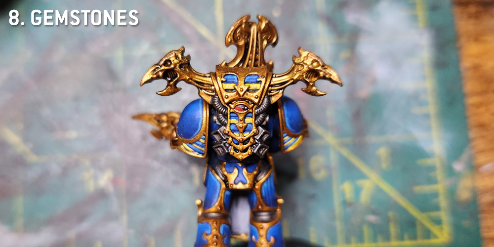This is when I pick out the gemstones, using the standard procedure laid out in our guide to how to paint Gemstones, Lenses, and vials. These gemstones are typically red on my Thousand Sons, which I like as a spot color.