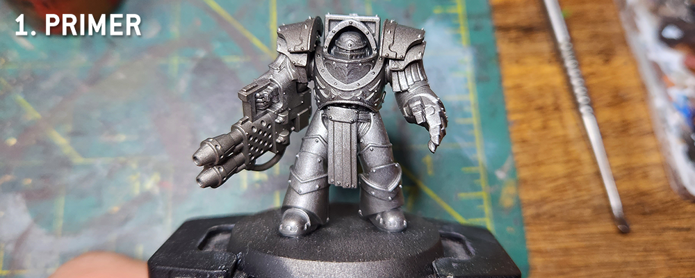I decided to go with more of a metallic paint look for my Pre-Heresy Thousand Sons, and so I primed them with GW's Leadbelcher spray. Once that was done I drybrushed the model with Runefang Steel to create some brighter highlights for the Contrast paint to work off of.In the future if I were doing this again I think I'd create more contrast by priming Leadbelcher, washing that with Nuln Oil, then drybrushing Leadbelcher and Runefang Steel over that to create a bit more depth of color before hitting everything with contrast.