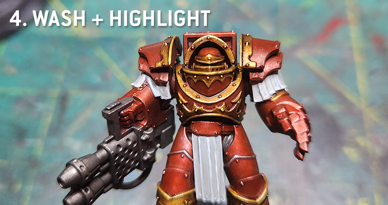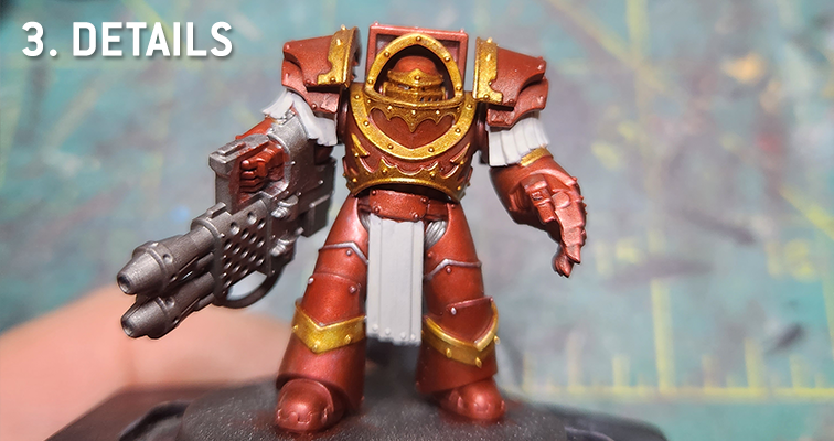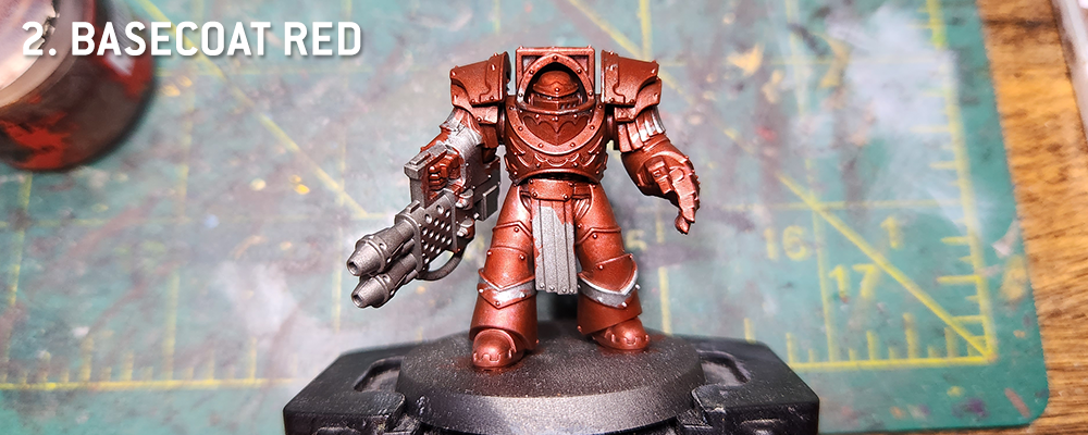 Step 2 was painting the red. This was just a regular coat of Contrast Blood Angels. The idea here is that the paint is thin enough to let the metallic paint underneath shine through, giving the model a shimmery look. This is resistant to edge highlights however, as they tend to dull the look. You're basically counting on the natural lighting in the room to do more of the work than the paint and that has its advantages and disadvantages.What do you do if you mess up later? It's nearly inevitable that at some point you're going to get another color of paint on your carefully prepared red later. If that happens your only real recourse is to paint over the area with Leadbelcher/Runefang Steel as appropriate, then cover that with Contrast paint again.