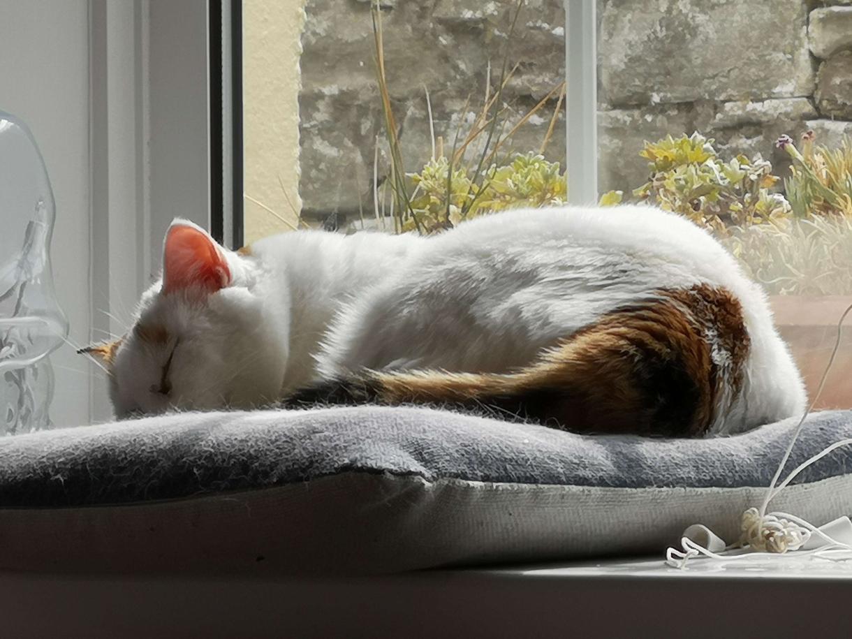 Faye is a good baby who naps perches on her favourite couch spot most of the time. Her coat has a lovely sheen, and her head is filled with happy dreams.