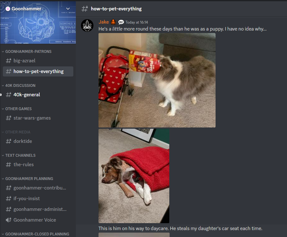 So um, yeah.A big thanks to all of the darling people on Discord who answered my call to participate in this silliness. If you're on our Discord, that means you're doing more than your bit to make Goonhammer the great site it is. If you're not on Discord and want to see the real time version of How to Pet Everything, then please pick up our Patreon at the five buck level. We'll attend to you in no time whatsoever so that you too can join the finest channel in wargaming.