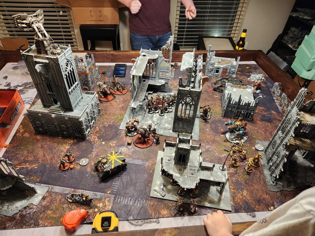 Because many missions put an objective in the dead center of the table it often ends up being a hotly contested area players fight over. You can see this in the photo above where Berzerkers fight a Chaos Lord in the building while a Helbrute and Venomcrawlers clash just outside. Here's what this looks like on a full table, combined with other large ruins to create a dense city center: