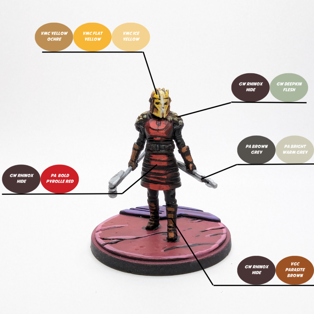 - For the Armorer’s torso, I wanted it to have a reddish look to it. I basecoated it with GW Rhinox Hide because while it is a brown, it has some red tone in it. I then kicked up the highlights and forced lighting with using Pro Acryl Bold Pyrolle Red down the center of the model.
