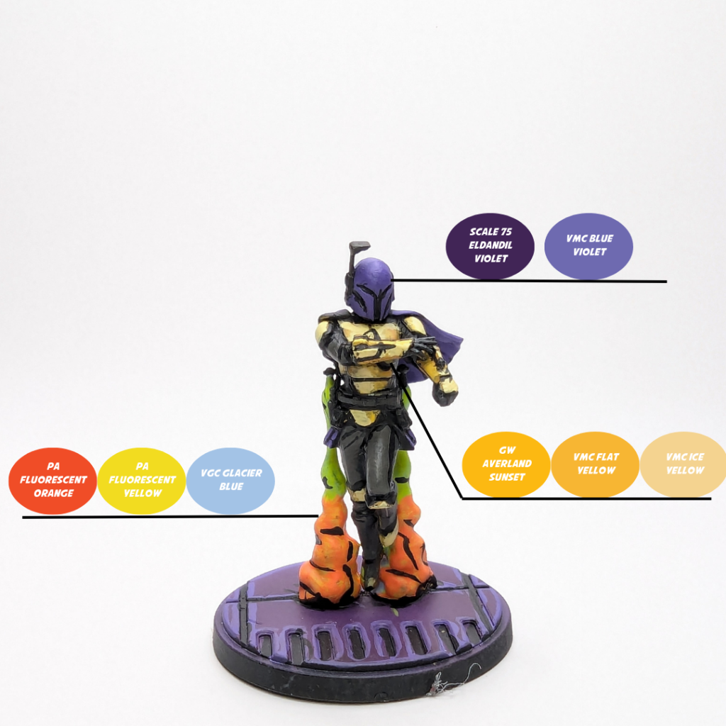 - I went against the box and card art for these two models. I wanted to keep them simple, but striking, so I settled on a purple/yellow/grey scheme. For the purple sections, I started with Scale 75 Eldandil Violet and then highlighted it with Vallejo Model Color Blue Violet.