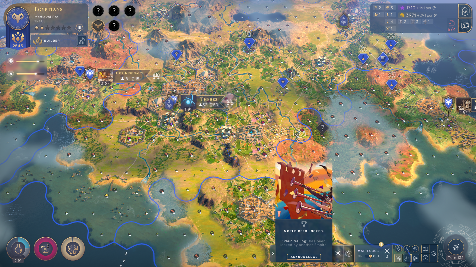 Speaking of cities, the most recent titles in the Civ franchise have fallen in love with the neutral city-state that can never expand but which holds territory to block actual player expansion and act as a nuisance, foil, or erstwhile partner through the middle third of the game. Humankind actually introduces them a bit earlier than Civilization (than the fifth game did at least), and has them as a major player from around the time you yourself can begin to develop cities -- but they’re much easier to integrate culturally into your civilization this time around. In fact, they’re pretty much designed to be a boatrace to see which actual player faction can influence them most quickly in order to bring them and their territory into the fold. The idea here is to force great power conflicts and curtail Golden Horde-esque “sweep the plains” aggression, and it works well. Perhaps too well.