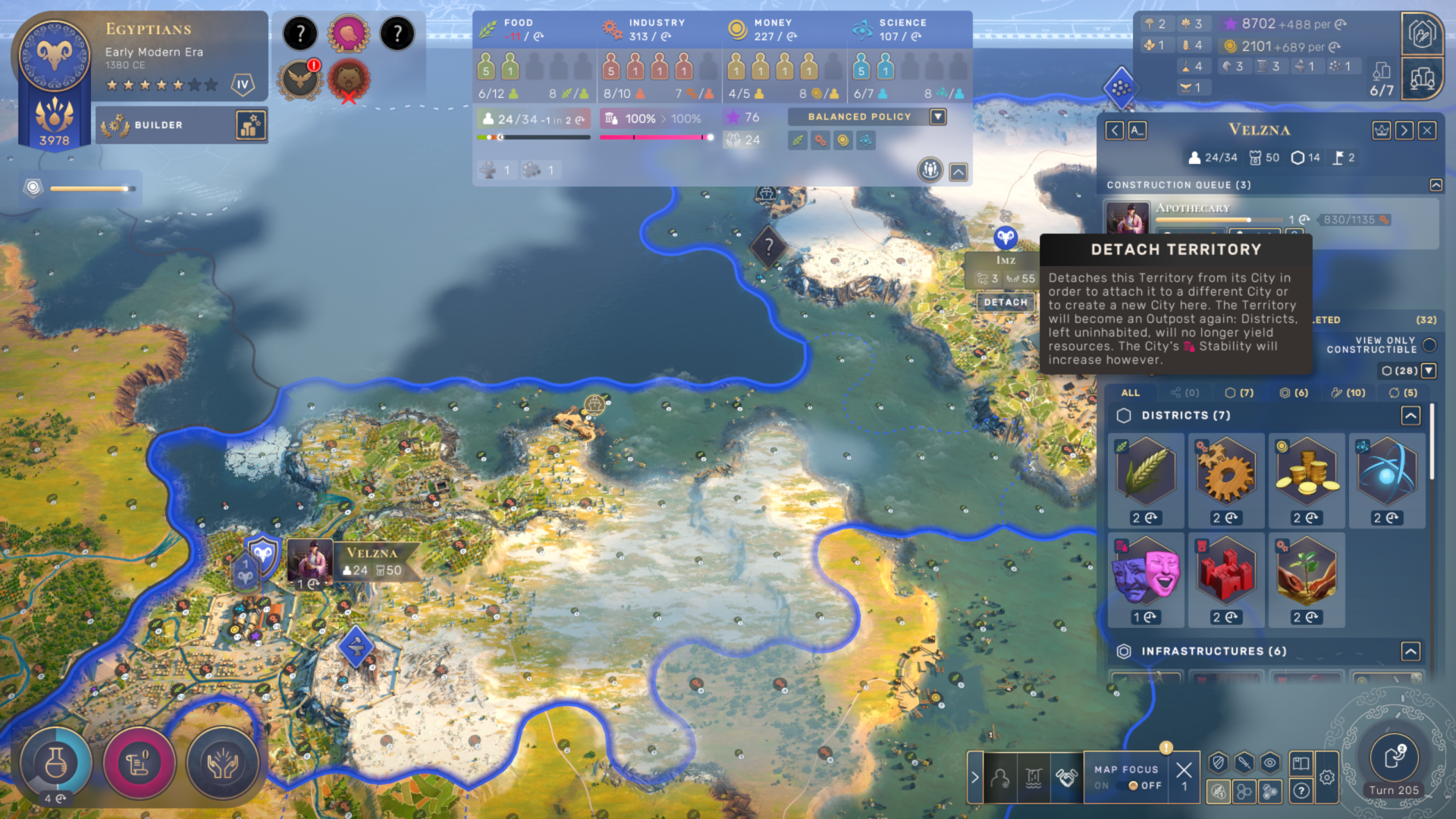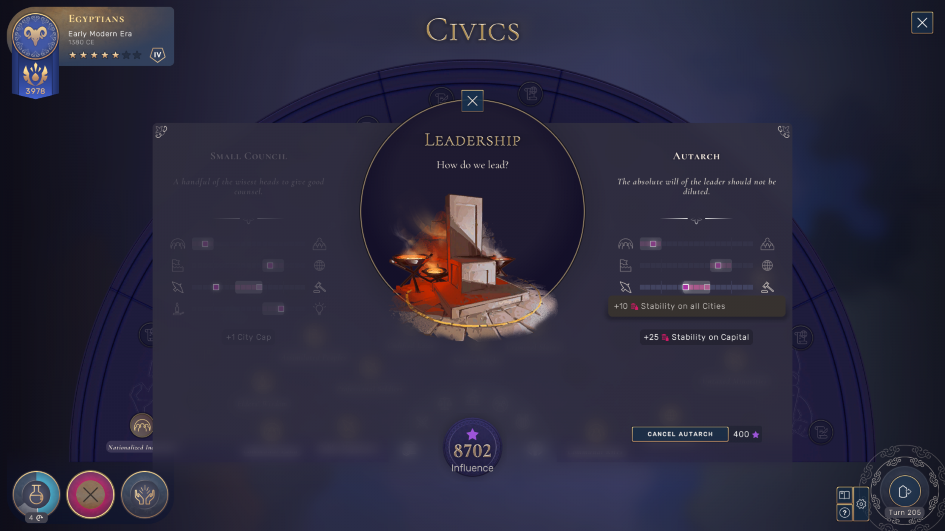 You can see the two benefits this civic provides at the bottom of the sliders, and the benefit of the slider position its influenced on the tool-tip.Cities, outposts, and territory formulation are the heaviest influence that post-Civilization IV titles in that franchise exert on Humankind. Here they’ve also squared the circle nicely -- in this specific system -- between the pressures to build tall and build wide, by introducing the existence of a proto-city settlement called an outpost. You found an outpost in unclaimed territory and then you decide whether you want it to become its own city...or if you want to attach it to an already-existing city you have, expanding your territory and greatly increasing that first city’s prestige and reach. Unsurprisingly, this takes a lot of Influence, the primary spender resource in Humankind which is very similar to the cultural resource over in the Civilization games, even down to its name and being color-coded purple. There are merits and demerits to either approach -- the primary thing to be concerned about with city development in Humankind is Stability, which decreases the more you expand to a precipitous degree if you haven’t invested in upgrades to keep it pumped up to the stratosphere. Honestly, excepting weird broken build choices they didn’t properly examine in playtesting and a more general critique coming up below, Stability being too kind to the player except (presumably) on difficulties well up the chain is the biggest balance problem with Humankind at launch. But if you love big cities, you’ll love how launch balancing works for you.