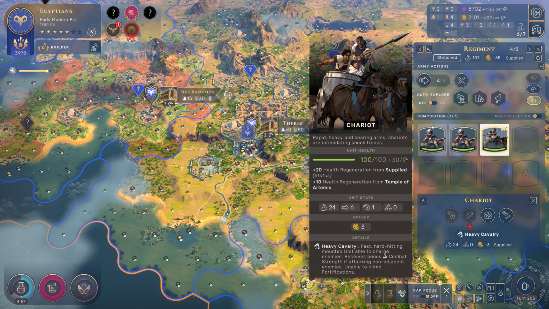 A look at the "one tile stack" system, and the level of detail the tool-tips provide. A plus!One thing that absolutely isn’t to taste, or at least isn’t to my taste, is the narrator. Nothing against the guy they’ve got voicing the thing; he’s working his heart out. But the franchise that Humankind is aping got Leonard Nimoy and Sean Bean to narrate their work; even the fifth entry, relatively lackluster on starpower, got veteran sci-fi actor and voice actor William Morgan Sheppard to lend his talents. This isn’t a shot at the Humankind narrator, whose credit I can’t actually seem to run down easily (the game’s IMDB only has two credits, for ‘Emperor’ and ‘Imperator’). Nimoy, Sheppard, and Bean came in and did their work with appropriate gravity -- all I need to do is type ‘Nimoy’s spear line’ and anyone who played Civilization IV for enough hours can hear Nimoy reading the quote from Homer attached to the Bronze Working technology: “It is entirely seemly for a young man killed in battle to lie mangled by the bronze spear. In his death all things appear fair.” The Humankind narrator on the other hand has...jokes. Snark. Quips. That’s not what I want out of a game like this. I want an appropriate reverence for the subject matter of ‘all of human history,’ even if it has been distilled down into a virtual board game. This is the only aesthetic misfire the game makes -- it’s otherwise gorgeous, with great UI -- but it’s glaring, painful, and ever-present.