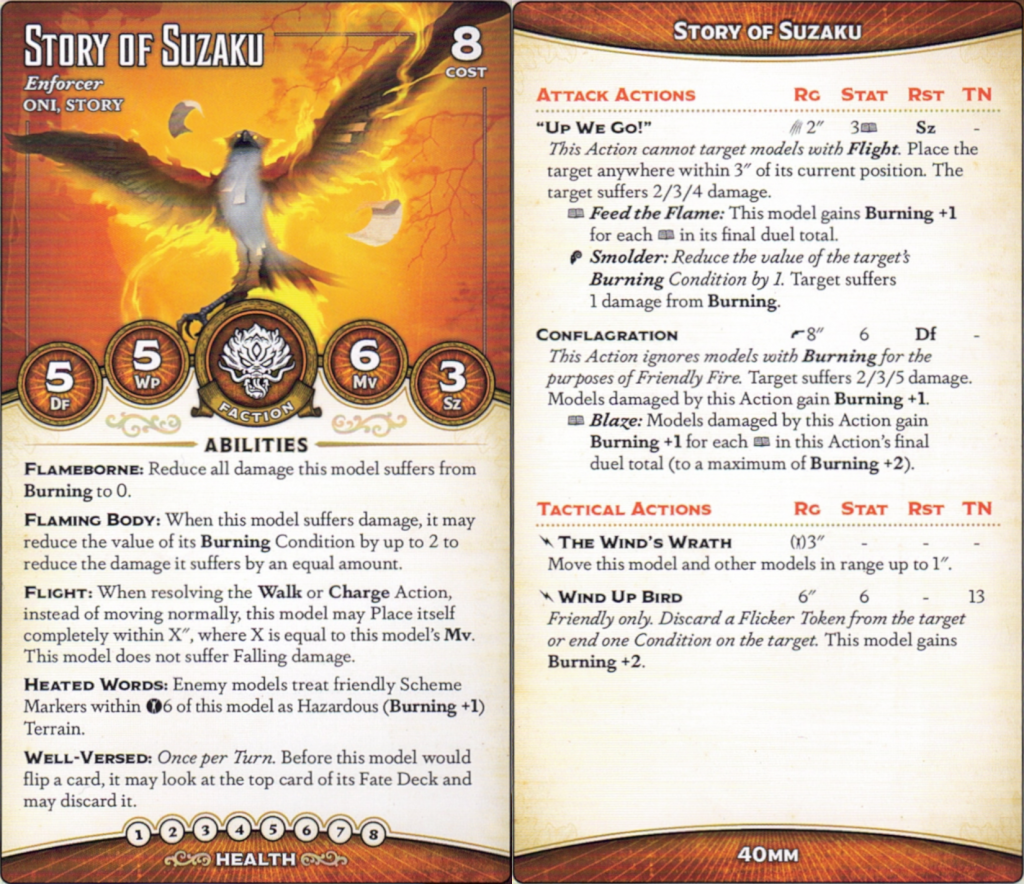 baby you're a firework. Credit: Wyrd GamesSuzaku hasn't changed, but the keyword has changed around it, so it's worth mentioning: this thing is insane now. The Wind's Wrath doesn't look so good until you realize just how many sources of Hazardous you have now. Same with Up We Go. Dunk someone into a rift in Ama no Zako's aura for a cool 4/5/6, then push them for another 2. Plus with Asami2 you can effectively reduce incoming damage by 4, to a minimum of 0, so if the opponent didn't bring irreducible damage they are simply never killing this thing. Absolutely stellar, channeling Up We Go through Rifts is brutal.