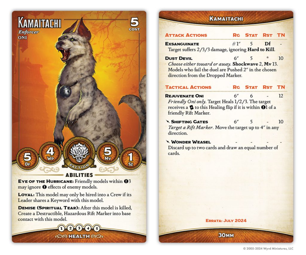 sure, when Wyrd tells people about their three-eyed wonder weasel they get praise, but when i do it i am asked to leave TJ Maxx. Credit: Wyrd GamesAh, the Kamaitachi. MAJOR changes here, to a model that was always... kinda weird. It's gone up 1hp and 1ss, become Significant, but most importantly it's got Eye of the Hurricane. This ability is bananas and singlehandedly changes some matchups; your opponent always has to prepare for it, and it can ruin their entire day if they forget about it. Because of how incredibly potent Eye of the Hurricane is, the Kamaitachi has the very unusual Loyal rule making it entirely Keyword-locked; only Asami can hire it at all. This solution is a bit inelegant but it does make balancing less of a nightmare.