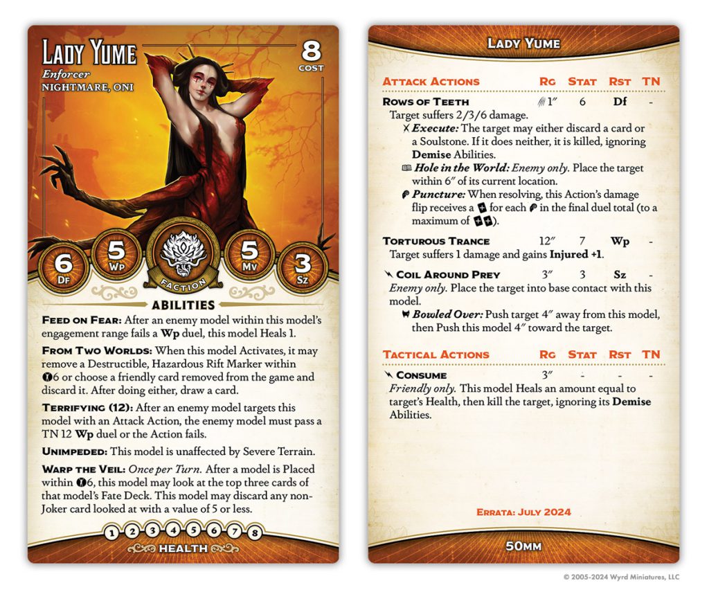 how bad can a nice lady named "mrs. dream" really be? Credit: Wyrd GamesDreamer is catching strays a bit, as it's not all good news. Poor Lady Yume has suffered a bit in the transition. Her stats are the same, although she now removes Rifts rather than adds Flicker tokens to draw cards. The headline front-of-card change is Warp the Veil going from Once Per Activation to Once Per Turn, making it significantly less powerful. Looking at three cards instead of two does not really make up for that.