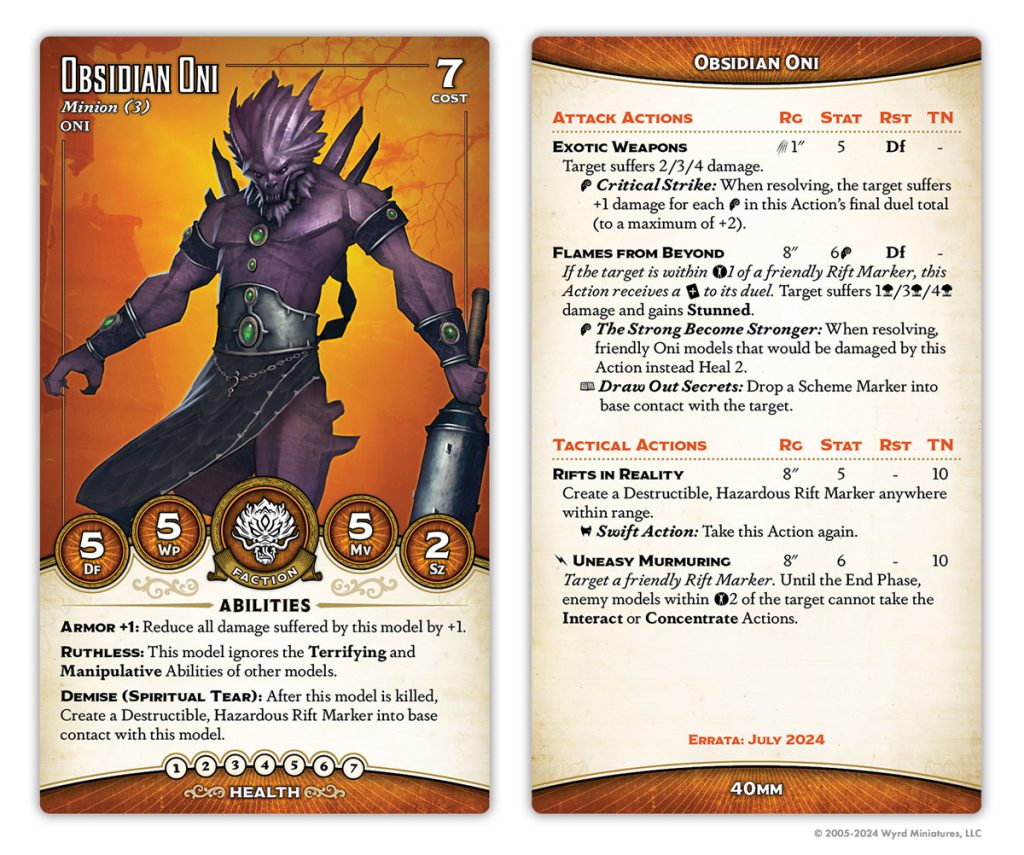 is obsidian purple? i guess it can be. Credit: Wyrd GamesFinally, we have these guys, who were really more of an odd token than a model before. They're still Armored and Ruthless, though they no longer explode for 2 damage and +2 burning when they go. You'll probably take some actual swings with them, but they've lost a stat and Blaze on their Exotic Weapons (though they still have the all-important Critical Strike).