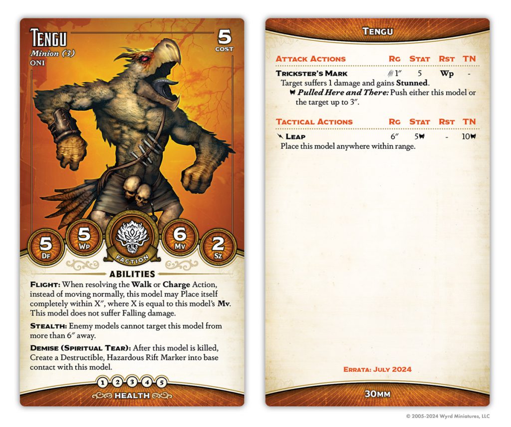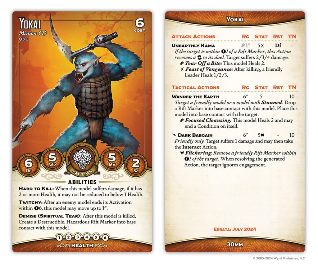 japanese cartoons led me to believe that these guys were cuter than this. Credit: Wyrd GamesYokai were extremely centered around the Flicker mechanic, so it's not surprising that their card has been basically completely rewritten. They've gained a point of Df and Hard to Kill, making them surprisingly tanky, though they've lost Frenzied Charge and (obviously) their Flicker Token-triggered Place in Ephemeral Warriors.