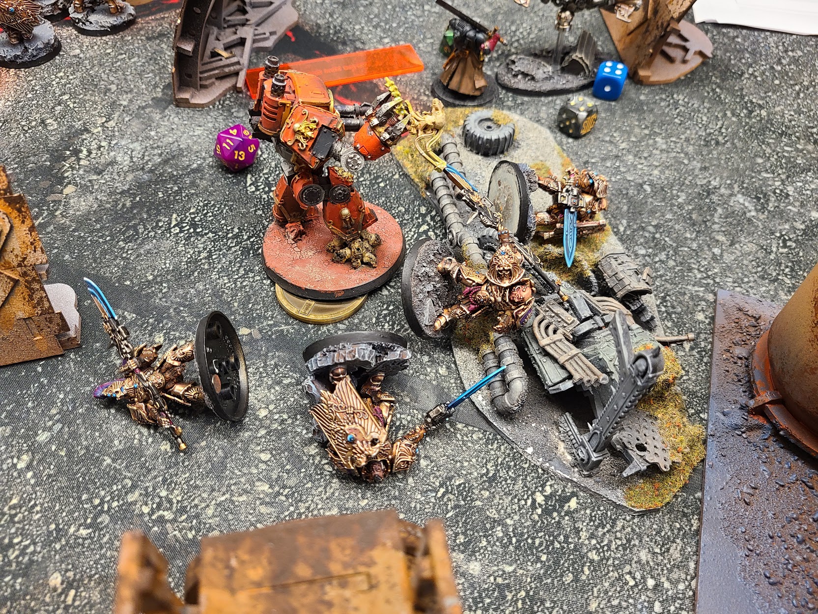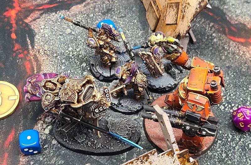 Amplified by multiple Litanies, Shock Assault and Savage Echoes, the High Chaplain rolled well with his Executioner’s Axe, inflicting 4 wounds as well as rolling a natural ‘6’ and guaranteeing 3 damage with at least one of them. When he was done swinging, there were no Custodes left standing. Astorath had castigated the Hykanatoi for their insouciance.