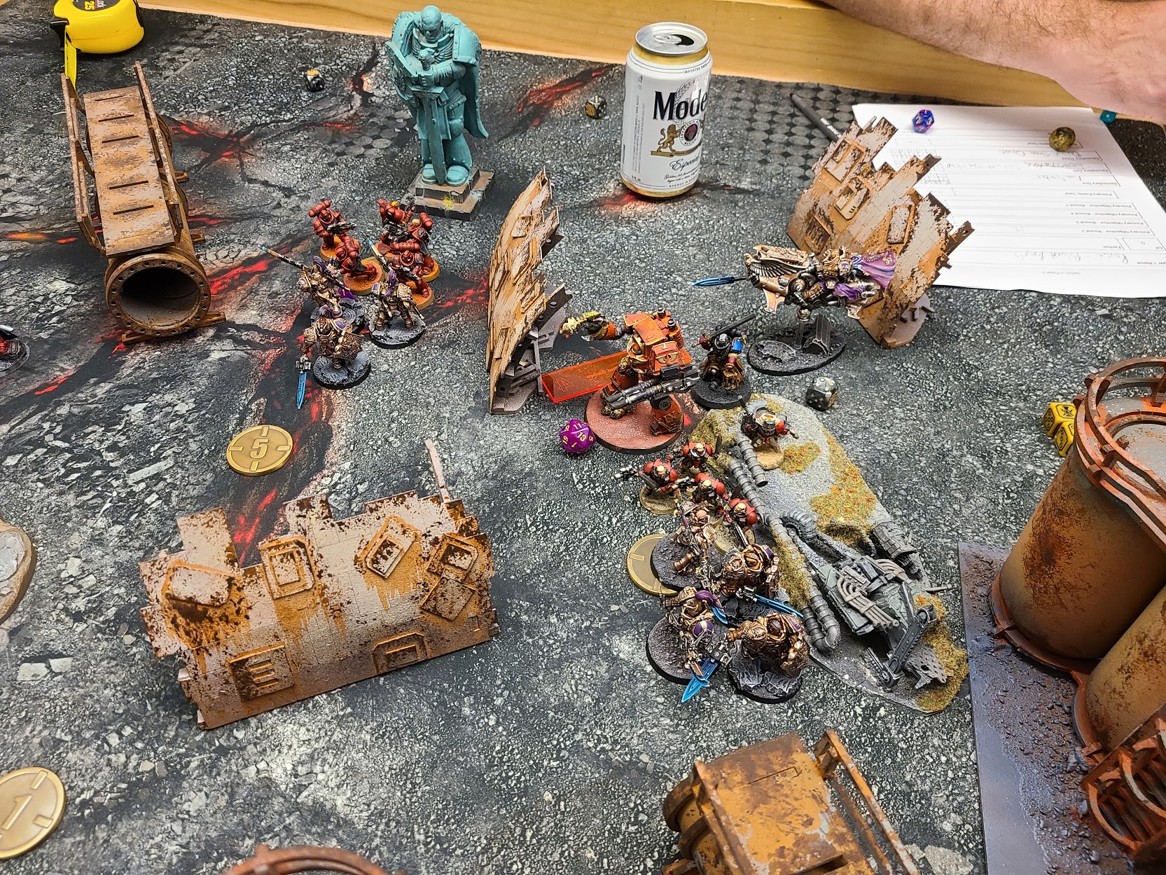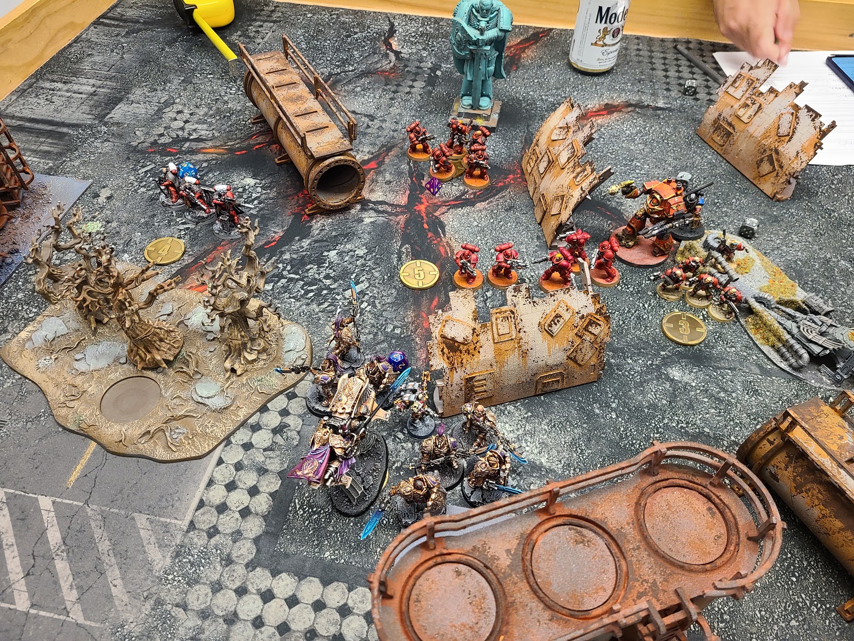 Playing on a 30” x 44” board is a different game and you should prepare accordingly. You’ll be up in each other’s business, immediately. Playing at 1000pts only grants you 6 command points, so don’t be surprised if you blow through them by your second turn (you’ll still get +1 in your command phase if your army is Battle-Forged). We might not adjust the objectives and deployment zone next time (despite the book maps not being drawn to scale). The new size allowed us to get down to business quickly, lining up charges and counter-charges from deployment.