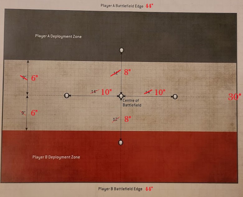As an experiment, we chose to adjust the objectives and deployment zones accordingly (rounding to the nearest inch): An objective placed 12” vertically from the center of a 44” x 60” board would be placed 8” vertically from the center of a 30” x 44” board. You can see the results below: