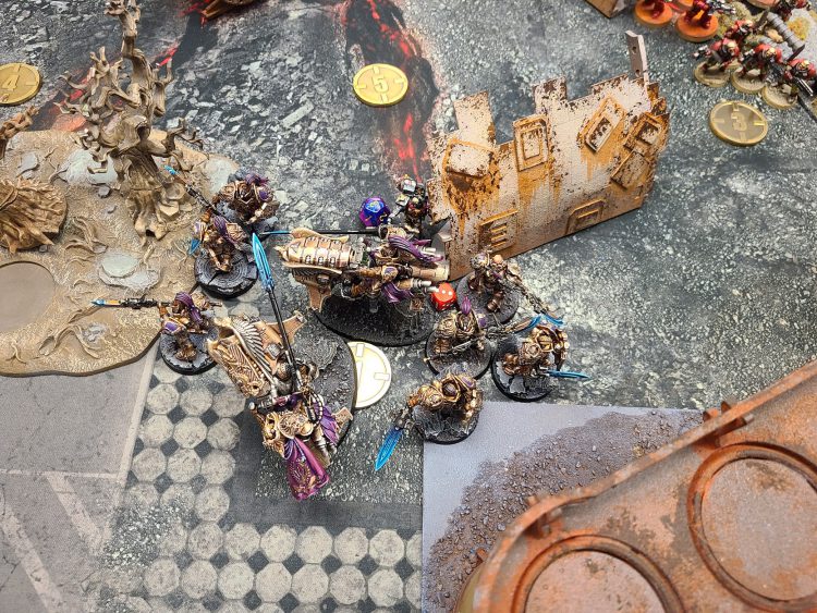 Seizing an opportunity to grab buku victory points, the Custodes’ Shield-Captain launched himself across the table for a Turn 2 attempt at Cut Off The Head (not hard given the size of the board). His bold action failed, but not without penalty: The Judiciar’s Tempor Mortis forcing him to strike last and suffer three wounds for his gambit.