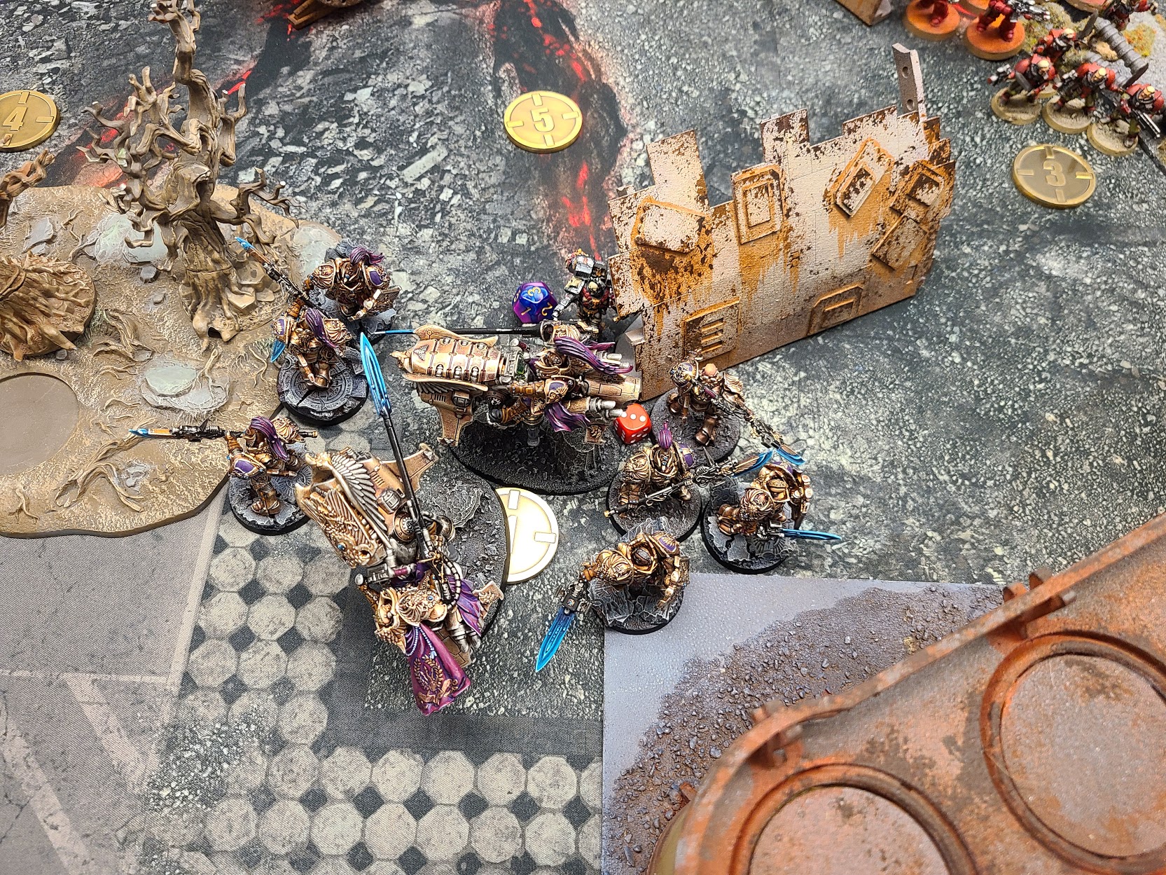 The remaining Custodes had mixed success: Killing one squad of intercessors with shooting but failing to remove the second in close combat. The scouts were also eliminated. Due to the size of the board, the foremost squad of Custodes were able to claim the central objective (objective 5 in the photo).