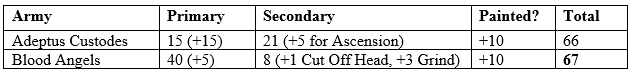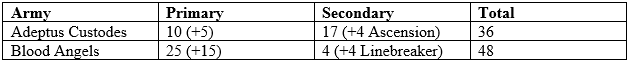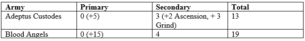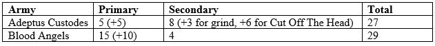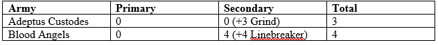 The swift assault of Lemartes, Astorath and the Death company allowed the Blood Angels to achieve Linebreaker by the end of their first turn. The subsequent removal of Lemartes and the Death Company allowed the Custodes to achieve Grind Them Down.