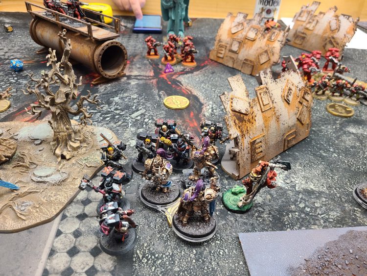 The Blood Angels began to widen their lead, claiming the maximum number of points (again) for their primary objective in their command phase. Proceeding warily, the Custodes sought to secure the central objective: The last squad of Custodian Guard interposing themselves between the dreadnought and their captain. The squad of Eliminators (which had largely been ignored) advanced ahead to distance themselves from the Custodes and claim Linebreaker: