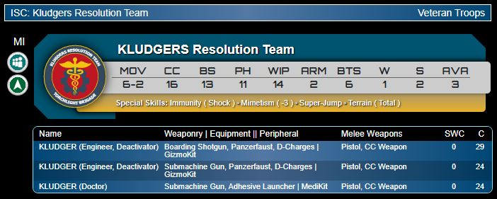 Genghis Cohen: Doctor/engineers in MI flavour, which isn't surprising; I thought this HI-themed Sectorial might offer something in that space. There's always a tension on whether you want your doc/engineers to be cheap as possible and wholly support, or embrace the fact that they can fight well if required. While I might prefer to have another Wound, or just be cheap Haris filler, honestly the combination of BS13 and Mimetism-3 makes these guys quite punchy. I think for that reason the Engineer SMG/panzerfaust is the best profile. The doctor only has an SMG/ADHL, and competes with the Silverstar Rover (or Kappa) paramedic. A Kludger engineer is also a beast in classified objective missions, and whether solo with Servants, or in a Fireteam, I love that these guys are also 6-2 with Super-Jump and Terrain Total. Makes the Doctor, although the worse profile in a vacuum, into a natural Haris pairing with the Nimrod FTO, who has the same movement profile. I think they are a good pick, but they may end up commonly cut for cost reasons.