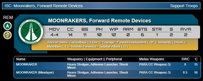 Genghis Cohen: We have Long Yas at home kids. And they're…maybe even better? Man, the flattering comparisons with existing units keep piling up. Joking aside, these guys are sort of a shorter-ranged but further forward deploying Long Ya. Their only loadout is heavy shotgun, ADHL and shock mines, their only option is to be a minelayer, which we would expect to be very common. This opens up a lot of shell games with Striders, and potentially a big boon to vanilla O-12 as well - something to watch out for in the eventual army update - because these bad bots are S2 & Mimetism-3. It needn't be immediately obvious what they are. That mimetism and forward positioning also makes them credible trading pieces on the attack, more so than Long Yas. I'd also note how well remote presence in the midfield can be supported by a Kludger engineer. Honestly I predict these to be a standout choice and present in many competitive lists. It's just a really nice price point: effective defence, but still something you can sacrifice if needed.Musterkrux: Having played enough White Banner to learn to hate the Long-Ya for what they could have been I quite like Moonrakers. Super nice to have the Minelayer profile also have the Shotgun weapon. There’s a bit of finesse here. They’re a regular order for your list, so tossing them way out there as a roadblock for your opponent isn’t the coup you think it might be and being single-use Camo I’d worry about trying to send them out on attack runs (particularly at Speed 4-4). Don’t get me wrong, they’re good. I’m just expecting the sheen to wear off after a few games with them, and having their community rating drop down from A to B or B+.