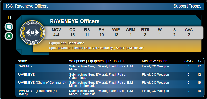 Genghis Cohen: For me, this is an extremely competitive addition to what was originally teased about the Sectorial. There are several other appealing Lt options given the presence of Ments (Chain of Command for 15pts). Silverstar Primes have a strong function, they're not just a passive trooper hanging around at the back using up a slot, and they get a SWC discount for being a Lt. Jamie gets +1 Order, which really leans into her role as a push piece. Sonya is usable specialist and also gives +1SWC. Against all of those options, I would have still considered the tried and tested method of 1 Raveneye Lt and 1 Raveneye decoy. The stock profile with E/M minelayer is already much more than a cheerleader, it's a specialist and defends your DZ. Taking two, and also having a secure Lt, is no hardship at all. So I was gutted to read in the Army changelog that the 12pt Lt option was removed from Torchlight. But...what? They introduced an identical option except for Holomask and +1 Order...for just +4 pts? They also introduced a CoC option for 19 pts? Dear god.