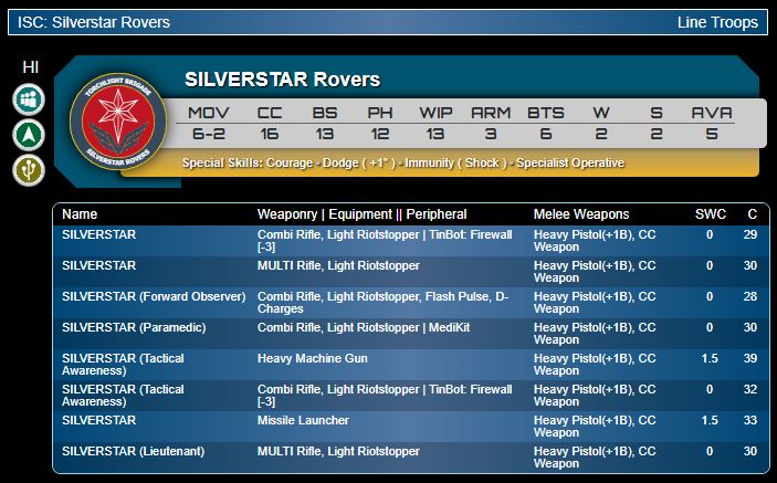 Musterkrux: Imagine deciding that ZuYong were cool and all…but what if they were all Specialists, had BTS 6 and just as much access to Tactical Awareness? Yup. That’s Silverstar Rovers for you. That said, Silverstar Rovers are great in the right amounts. I wouldn’t go ham and put three of them in a list but 1-2 of them are going to do very well.Genghis Cohen: Yeah, ZuYong are an apt comparison. Not the standout stars, but really useful in composition for pure HI Fireteams, which are solid, if not usually a top competitive strategy. Personally I like these slightly more than their Yu Jing equivalents (cries of “power creep!” sound in the distance), particularly the Firewall and HMG variants. Since they're both Tac Aware and all the Rovers are Specialist Operatives, they bring a lot of utility, if not for that low a price. But building that pure Core team around them will definitely force some other sacrifices in list-building. I would certainly note that Silverstar Core/Haris teams can be based on either them or Hellblazers, which makes those, the cheaper option, perhaps a better basis for a small team that can get its long-range firepower from non-composition-bonus units.