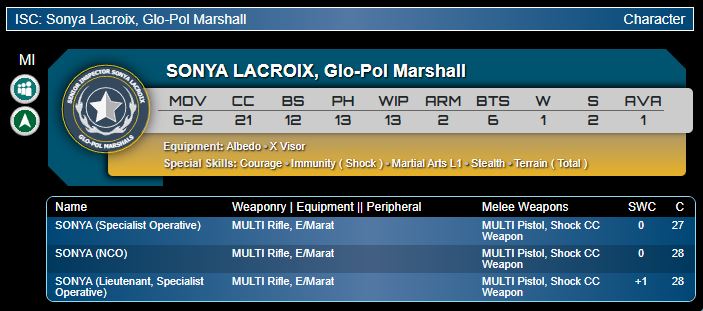 Genghis Cohen: A fairly common, and in my opinion uncompetitive, archetype, this is our middleweight rifle character Dire Foes model. There's nothing wrong with her loadout - multi rifle and X Visor is a decent combo - but her gunfighting skills are otherwise quite tame, at BS12 with no particular resilience. Stealth, Terrain Total and 6-2 movement are at least a little bit of mobility. The unique selling point is Albedo, which I think pairs well with the Specialist Operative profiles. Being invisible to MSV during Round 1 won't often help you kill them, since most MSV pieces actually offering early game AROs have Sixth Sense from fireteams. But it could sometimes offer a nice attack vector (e.g. against a Marut) and what it does do is let you sneak objectives in Turn 1 against strong MSV overwatch - Riot Grrls, Suryats, Kamau, Bolts, Grenzers, those sort of obstacles are common. Finally, Sonya offers a +1SWC option which could be worth considering, since Torchlight can access Chain of Command for only 15pts via AVA1 Ments. Ultimately I doubt Sonya will be a top competitive option, but is certainly usable.Musterkrux: I’m pretty meh on Sonya. Once you start getting close to 30 points in cost you either need to be bringing a second wound/NWI or you need something like Mimetism or MSV to help you win F2F rolls. Sonya isn’t quite there for me yet, though she does bring value in sliding an NCO into a pure Rover fireteam. That’s something. Also worth noting that CB have spent many hours delicately scratching away at her profile art to produce something that is completely dialed into my station. I’m a simple man, I see a short jacket, baseball cap and a braided pony-tail? I’m gonna smash that Like and Subscribe button.(Straight to horny jail - Ed.)