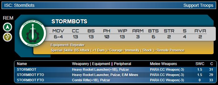 Musterkrux: 2Ws and Remote Presence? Be still my heart. It’s not a Vostok, but it’s also two thirds the price. It’s not a Tsyklon either, it’s got 2 goddamned wounds. Stormbot is their own ‘bot and shame on you for trying to make them feel bad about themselves. Part of me loves the idea of putting the Combi-Rifle FTO into a Haris and throwing 5 dice at things like the little HRMC that could but even at Dam 14 combirifles are just scratching the paint on anything you’d want to be shooting at. So…don’t do that.