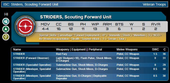 Musterkrux: Striders are pricey but you’re getting a lot of nice kit for the cost. Striders might fall into the Guilang trap of being far too expensive for a skirmisher but I doubt it, as Shock Immune NWI forgives many sins. I’m not sure what my favourite profile here is. The +1B Light Shotgun will be the terror of the mid-field but a Mine Layer dropping a Deployable Repeater while remaining under a Camo Marker represents the sort of defensive utility that Moran Massai wish they had (and that’s saying something).Genghis Cohen: I think these are great and picked out the same profiles you did. They compare really well in cost to similar units like Guilangs and Bakunin’s Initiate Observants, given how much more capable of midfield brawling the second wound makes them. What really remains to be seen is how well the Sectorial builds around hacker (and potentially GML) play, but even without that these are nice midfield specialists. It's quite uncommon to combine specialist and minelayer, let alone NCO on top. It's a real shame for vanilla O-12 that these didn't make the cut; I think they could have been very popular indeed.