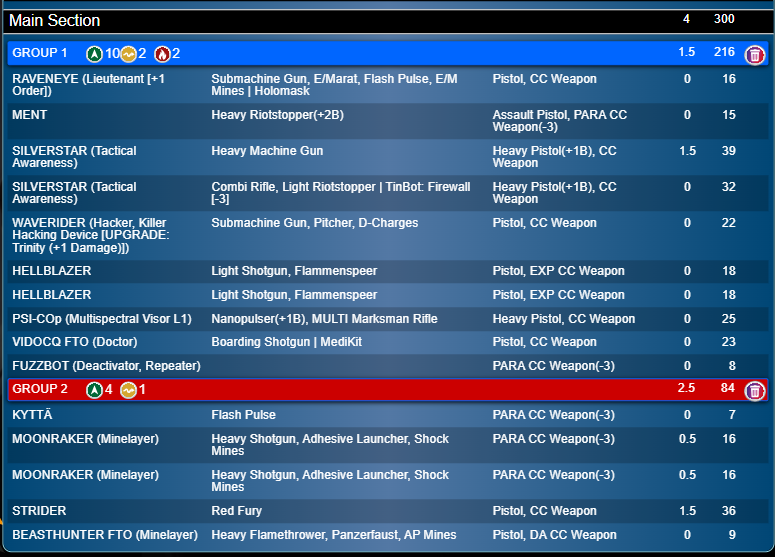 Well that's 300 on the nose and only 4 SWC, 15 models, with only 1 active turn long range gun (although 2 more which work at 24") So okay, maybe even this Sectorial can't make a pure HI Core and a decent Haris in a 15 order list work. Or maybe my shopping spree instincts are just trash. One final tweak I considered were changing the Ment into a Raveneye decoy Lt, which is slightly less safety against LoL, but would let me upgrade the Beasthunter into a Kappa Hacker.