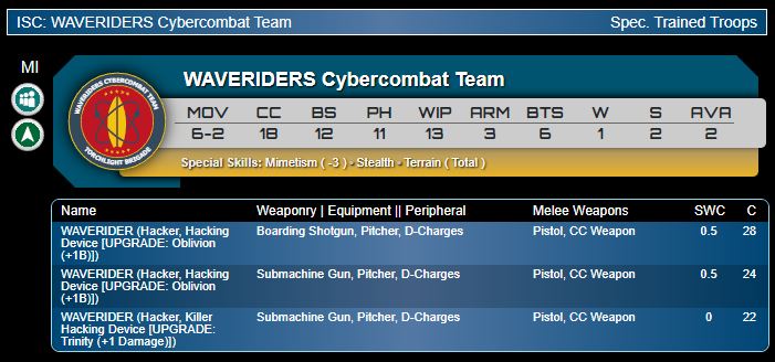 Genghis Cohen: As soon as I saw that these guys were capable of pure Fireteams, I thought they would be make-or-break for the Sectorial. Having that infowar capability to support your big, hacking-vulnerable HI team is important. Personally I am impressed here. I rate these guys only a little below the mighty Dartoks. They bring Pitchers, which are really the most important hacking tech. Given a choice between Oblivion+1B and Trinity+1Dam as their signature programs, it's impossible to say which I would prefer. Both are top notch threats to enemy hackers in your active turn. Clearly the normal hacking device offers more flexibility, at the expense of being a little worse against enemy hackers in both active and reactive, and a slightly higher points/SWC cost. I am certain no one is taking the more expensive profile without a pitcher though! As with others, these guys are 6-2, Stealth and Terrain Total. Nice.Musterkrux: As above, I’m a fan of any specialist who can look after themselves. My favorite profile, though? Tough call; in a vacuum I vastly prefer the KHD for the cost efficiency but in the context of Torchlight’s ability to project hacking areas I almost wonder if you lean into the SMG Hacker with Oblivion +1B. The BSG Waverider is probably a smidge too expensive for my tastes but, if you toss them into a Fireteam that has a Tinbot you’re going to make your opponent very unhappy.