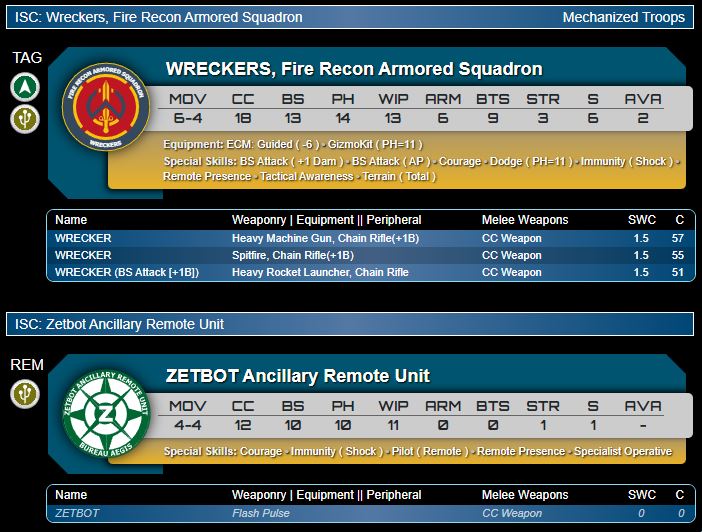 Genghis Cohen: Yeah, agreed that's the best profile and it's not too close. I could also see using the HMG, but not when the HRL is on the table. However I do know some players who don't like similar BS13, B3 platforms (the Stigmaton) since they don't trust it to beat AROs. I mean 51-57 points is just so cheap for what's basically the full TAG package. Yes it's ARM6 and doesn't have EXP AROs, so it's not a main battle TAG, but for that price…wow. I think this will probably best the Silverstar Prime for title of ‘primary Sectorial firepower piece’ but at least there's some differentiation. Honestly you could afford to take both if you really value long range power in your lists. I do wonder how popular it will be in vanilla. It's so cheap, but it's not particularly an assault piece, so in some ways it's just a Zeta with less armour, no climbing plus, and a harder time winning shootouts. Points cost is the lord and master of all, but it might be a false economy here. One to experiment with.