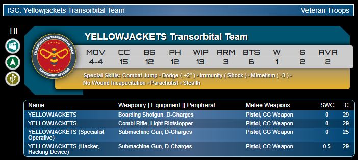 Genghis Cohen: Looking at my beloved Hellcats and then back at these guys, I think the game may have moved on slightly! Once again, this profile showcases the underpriced nature of SMGs and hackable/1W/NWI/shock immune HI. Look, it's an effectively 2W model which can get into position to attack quickly, or complete a mission. Shout out to the hacker as well, who can complete most of the classified objectives in the deck. I particularly like that these have Stealth, which makes maneuvering after a hot drop into the DZ much easier.