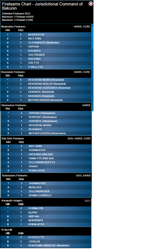 Bakunin still has good options for big Core teams with level 4-5 bonuses. We may still see Level 5 Reverend Fireteams with a Moira (and/or Kusanagi) firepower piece, Cenobites for close assault, Custodier hacking and Healer or Agatha medical support. Just as in N4, the raw combat power of 5 Riot Grrls (with or without Avicenna and/or Fiddler) could be even stronger. Both these compositions suffered in N4, but are still powerhouses.Haris Teams