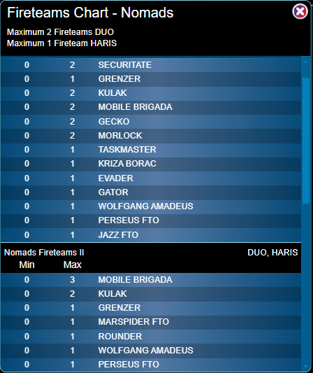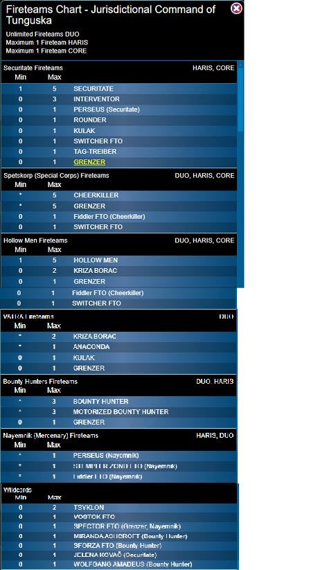 What jumps out immediately here is that if you want a bonus for your Haris team, it has to include 2 Kulaks or 2-3 Mobile Brigada. No (counts as) tags for Generic armies! Now these both have advantages. Kulaks have a hyper-efficient HRL profile, and a CoC profile which would be useful in some lists, and in Fireteams that intend to stay back in the DZ. Alternatively, they have a very useful hacker/Discoballer which will be popular in teams that want to manoeuvre to Objectives. For Brigada, the stars are definitely the Tinbot Firewall-6 profiles. There are a couple decent hackers available to Haris teams (the Rounders Kulak and the Brigada themselves) and you could even consider doubling up.Marspiders seem like a nice team piece both for revival as a paramedic/engineer, and as close assault. But the army app lists their FTO profile as valid for the Haris team, and there's no such thing. Presumably will be caught in bug fixes. The Rounder red fury, Grenzer sniper, and Wolfgang all seem usable. Perseus would be an odd choice, since he can't Super-Jump while other team models Move - he's probably better off solo, or just starting in the team for security before splitting off.