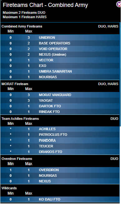 Limited access to Fireteams (one Haris and two Duo teams per list) break new ground for CA as a vanilla faction - none of them are particularly popular in competitive lists at the moment, but there are some uses.