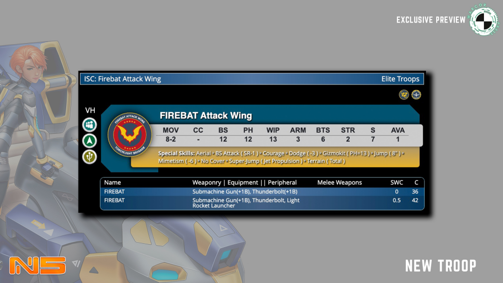 Do the weapons and skills on the Firebat support that mission? At BS12, Mimetism-6 but No Cover, it can engage most units at a relative advantage, but will fall off hard against MSV. It has an OK weapon for outranging most models with the Thunderbolt+1B (the ordinary Thunderbolt on the more expensive LRL profile will probably struggle). The Firebolt seems more likely to want to be paired with an apex shooter which can remove hard AROs. Then it is free to hunt down more vulnerable prey. It might be better with a 16” range weapon though - that SMG+1B will put damage through within 8”, but that means risking hacking and template AROs if it wants to attack at full effect.