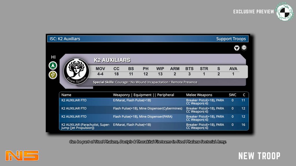 These seem like great defensive chaff and Fireteam filler for Steel Phalanx (and Aleph, but they are only AVA1 there). A very unusual unit, the nearest comparison might be O-12’s fairly recent Sekudroids. They have no lethal weapons besides pistols, being more focussed on threatening non-lethal effect, which kind of tends them to AROs and Reactive play, although they can certainly swing into an Active turn move sometimes, especially as part of a Fireteam. The real kicker to this profile is NWI with only 1STR, but Remote Presence. That means they can take 2 wounds at once and stay up, which makes them a real pain to clear out. Be careful of Shock ammunition though, because unless there’s some rules change we aren’t getting, that will drop them with a single wound. Overall this seems like a unit with a limited, but clear and very effective role. A big factor for them in Steel Phalanx will be whether they count as any more lethal unit for calculating Fireteam bonuses. Even if they don’t get, e.g. (Myrmidon), players could staple one good Wildcard to two of these and get a lot of value from them.