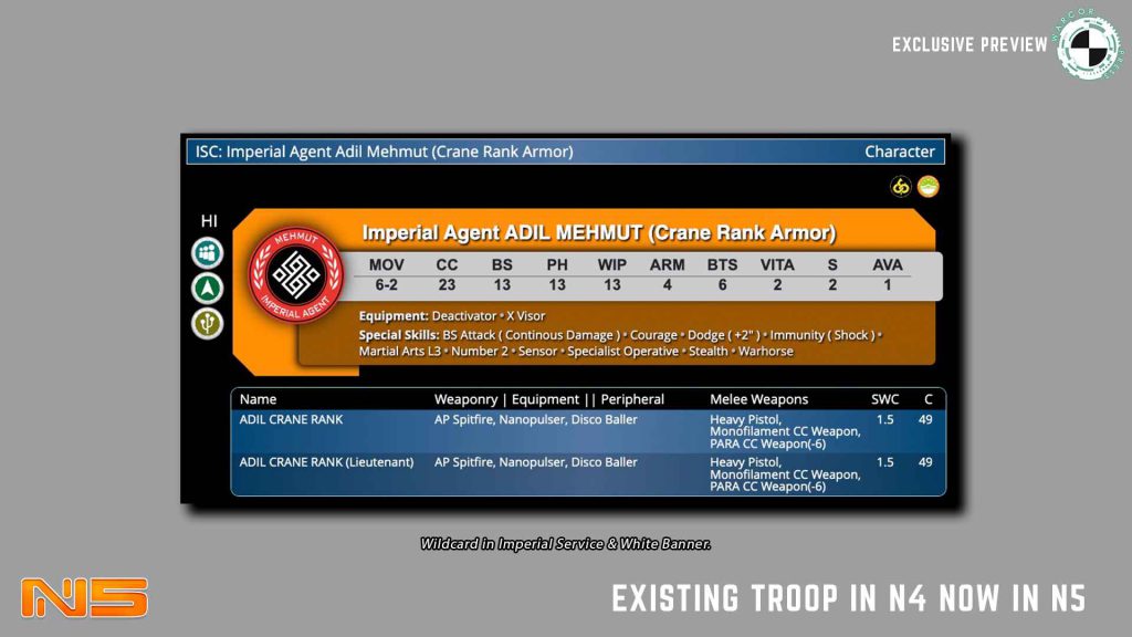 We knew Imperial Service were in for some glow-ups and this certainly qualifies. Adil Mehmut was a decent utility piece before, but hardly considered that powerful. He fell into the classic character tropes of utility, lots of abilities, but with bloated cost and no big firepower. This version blows those limitations apart, he’s got Burst 4 AP firepower with Continuous Damage on top. As units like the Azra’il has shown, that is a heady brew, and Adil will no doubt have plenty of Fireteams he can join in his Sectorial. Beyond that strong mid-range firepower, he’s a close combat beast, a Specialist, he’s immune to Isolation and to BS Attack(-X)...things like Sensor and Stealth are great but seem insignificant next to the usefulness of a Discoballer. What an all-rounder. As a highly resilient model who can’t be Isolated (assuming that benefit remains part of Veteran/Warhorse) he is also a very secure Lt option. No notes, he seems likely to fully justify his cost. We wonder what ordinary Crane Agents will look like in comparison and how they can possibly compete with this dude.