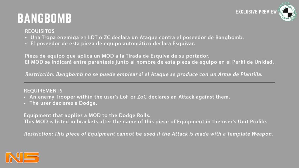 OK, maybe this is a weird name too far. Perhaps “flashbang” would have been better, CB. Just a suggestion. This is a special way to increase a model’s Dodge stat. We have only seen it on one unit (Hassassin Ayyar) as “Bangbomb(+4)”, which means they Dodge at PH+4, but that doesn’t work against direct templates, and it only works in response to an attack. So if the model moved, didn’t provoke any AROs, and decided to declare Dodge (in order to move further without risking provoking any) it would roll without the bonus. Fun, flavourful, arguably unnecessary when Dodge(-X) already exists. But it does allow CB to design units which can Dodge very well to win FtF rolls, without being near-immune to templates, or abusing Dodge movement shenanigans.