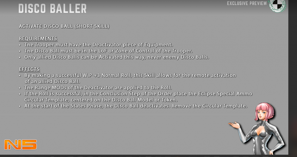 This is a Disposable(2) piece of equipment which basically shoots Eclipse smoke templates, with the same rangebands as a pitcher or combi-rifle. The twist is that you are actually placing the Discoballer at the centre of that Eclipse template. The smoke vanishes at the end of the player turn as normal, but a friendly model with a Deactivator can bring it back, centred on the Discoballer, by spending a Short Skill. Access to Eclipse smoke is a game-changing capability. While Disposable(2) is a heavy downside, and it won’t always be worthwhile or practical to buy that out with Baggage models, the range bands are much more forgiving than a thrown grenade, and the re-usability will be situationally an extension to that Disposable trait. Like other smoke, and pitchers etc, this will also be much more reliable if used in a Fireteam.