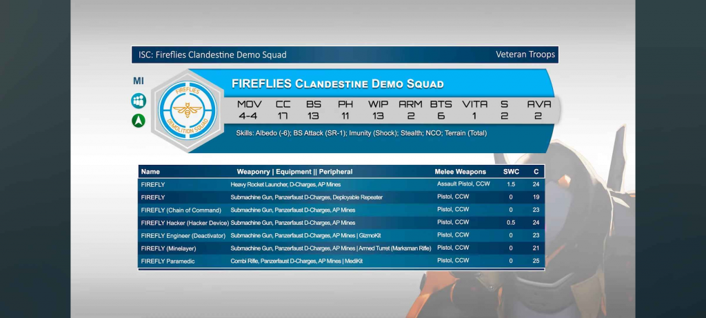More of a supporting and utility unit, Fireflies mostly have specialist profiles with SMGs and panzerfausts. This keeps them cheap while still giving them a way to leverage Albedo(-6) - this revamped skill will make them situationally very useful. Combining that ace in the hole capability with NCO and simply being a specialist will make them a key part of Fireteams in Kestrel armies. We are most drawn to the non-specialist, Minelayer profile. That’s because it comes with a marksman rifle turret. See the new equipment section below, but the common assumption is that’s similar to the ITS F-13 turret, in which case it’s potentially far more useful than a mine. Those are gone in one Order, whether they end up harming the enemy or not, while a turret can last multiple Orders with a bit of luck and careful placement. At 21pts, those might be too expensive to spam, but folded into other roles in Kestrel they can really contribute to a spread out defence.