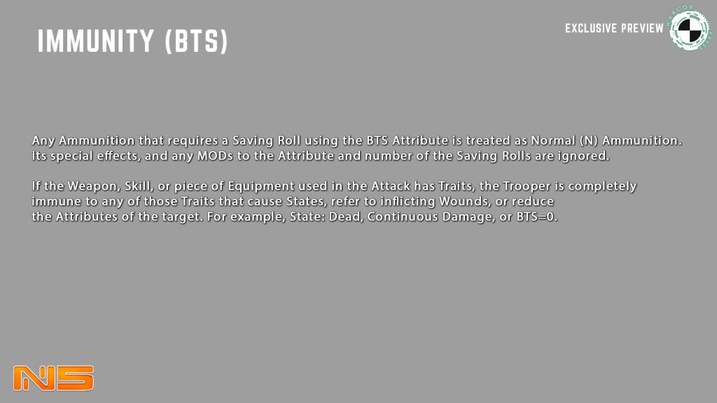 This is a big one. While it’s not confirmed that Immunity (Total) is actually disappearing, we have seen units with Immunity (ARM) and Immunity (BTS), and Koni has confirmed that the most famous and fearsome Total Immunity units, Bearpodes, will be changing to Immunity (ARM). What does this mean? Immunity works as before, the bearer treats all hits as Normal ammunition, and totally ignores all states inflicted by those hits. It also still seems to make the bearer totally ignore non-lethal effects. Immunity (ARM) and (BTS) still don’t work against Comms Attacks like hacking. The change is this: if a unit previously had Immunity (Total) but now has Immunity (ARM) that means any weapon, including non-lethal weapons, which key off BTS instead, will be fully functional against them. That will make Bearpodes and similar units able to actually be contested by flash pulses, E/M weapons or mines, etc. They will still be great assault units due to their other strengths, and Immunity (ARM) is still a very valuable skill, but they don’t no-sell quite as many common defensive tools. Immunity (BTS) has only been seen on one unit so far (Nomad Switchers) and will likely be more situational, just because there are fewer BTS-attacking weapons in the game. It will be very interesting to see which current Immunity (Total) units get either skill, if anything keeps the full package, and any other wrinkles CB choose to play with in this design space.