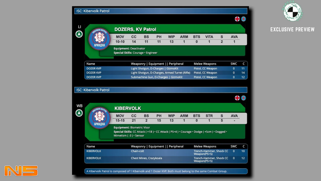 Not what we expected from the horrorshow cybernetic wolf unit which grabbed everyone’s attention in the N5 lore book! This is not a big tough warband unit like Dog Warriors and Bearpodes, it is more akin to existing Antipode type units. You have to take one Kibervolk and one accompanying Dozer. Let’s discuss the Dozer first as it’s much simpler. It is a very ordinary support trooper engineer. Probably something a list could use if it has a TAG or other big heavy models that might get hacked/EM’d or have STR. But since we don’t expect it to join Fireteams (that would be unusual for a dual-model unit like this) it’s hardly a very powerful model. For that reason, many players might be drawn to the profile with the turret; although it’s the most expensive it does bring something extra to its trooper slot. The Kibervolk itself is a sort of Regular warband, lacking smoke but exceptionally fast, Dogged, with Mimetism-3, and it can make use of partial cover. A better corner guard than many warbands, and although it doesn’t have Berserk it can move 6” into an enemy and swing Burst 2 melee at it. The Kibervolk has ‘crazy koala’, which would normally be plural since they are Disposable(2), but it doesn’t have Minelayer, so RAW this profile doesn’t start with one koala deployed. That isn’t the end of the world, they are still great kit for setting up Active Turn forks, but it is certainly better for a cheap, DZ-deploying unit like this to have Minelayer. Hopefully that’s just an editing issue, since the Dozer with turret also doesn’t have Minelayer.
