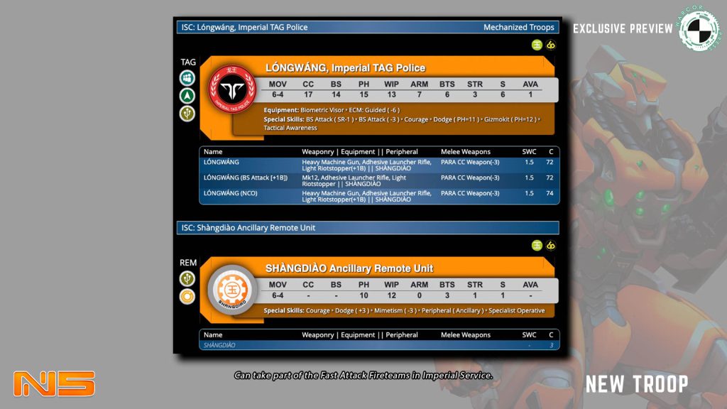 Seen as part of the Longwang TAG, the long and short here is that TAGs (some, at least) can split off a little remote to go do Specialist things. That has to happen during the game, they can’t simply deploy separately, but there is no required coherency distance between the two models once that happens. This appears to be a straight upgrade from the remote pilots available to Remote Presence TAGs in N4 - it provides the ability for the TAG to do mission objectives, and doesn’t introduce any weird vulnerabilities, risk the remote being killed somehow and thus disabling the TAG, any of that weirdness. There are a lot of unanswered questions about which TAGs get this. It does seem analogous to those previous remote pilots, but the Longwang does not have Remote Presence, it’s a manned TAG. In many ways this just makes us more curious to see how TAG pilots (which are clearly being introduced to all factions with manned TAGs, as separate unit entries) will work. Without having the whole picture, we are excited but almost apprehensive here. TAGs might be net winners of this edition; if all of them have a clean and efficient way to perform as mission Specialists, on top of their other strengths, they could become even more prevalent.New or Revised Units and Profiles Revealed