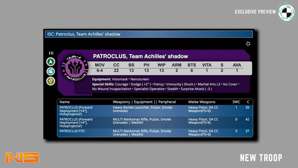 Patroclus, back when he was an Aleph unit (he was written out of the fluff in N4) always struggled to find a space. He always had to be second fiddle to Achilles, without bringing anything too different or complementary to the table. Holomask is super cute, but an expensive unit (can’t make a hero into just a cheap scrub) finds it difficult to get much value from it. Here, he is reinvented as a fast, aggressive piece who combines low ARM (for a HI) with Nanoscreen and No Cover to keep his points relatively low and effectively being free to move around without any concern for staying in partial cover from the terrain. That’s an attractive sort of unit, and as well as Holomask, to at least confuse opponents slightly during deployment, he’s always a Specialist with smoke grenades, as well as a high quality melee model. This guy does a lot. We would wait to see the other units he can Fireteam with (likely anyone from Team Achilles, at least in Onyx Contact Force, and possibly in generic CA) but the Holoprojector/Forward Deployment version seems like an aggressive piece that can do a lot of different things fairly well.