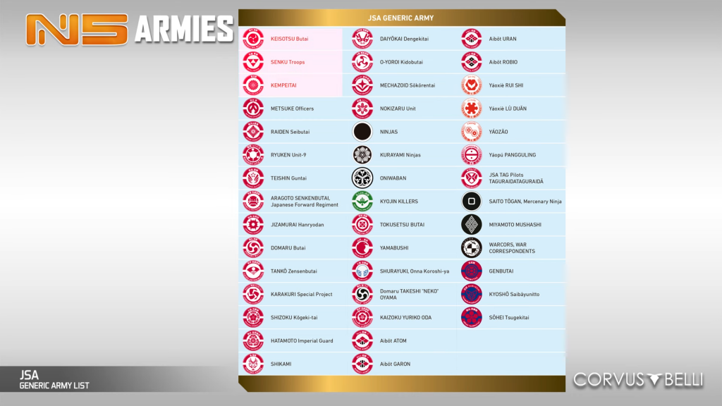 Infinity’s newest ‘full’ faction comes in swinging with 43 units. We know that one Sectorial, JSA Oban, will be essentially the same as old JSA (when it was an NA2 Sectorial), so this generic faction is a mash-up of that and the new Shindenbutai Sectorial. Maybe because the rosters weren’t as broad as bigger Sectorials from older factions, generic JSA does seem to have most of the units of both its Sectorials. It gets both TAGs, all the iconic samurai heavy infantry, what seems to be four types of ninja (Ninjas, Kurayami Ninjas, Oniwaban and Kyoshin Killers, which are as yet unknown), both hidden/camouflage ARO types (Ryuken and the new Raiden). The only things missing seem to be a couple characters. The iconic Shinobu Kitsune is missing, as is Yojimbo, and even the other biker character, Kuroshi Rider, although there are rumours one of the new units is a replacement. Overall this seems a roster which builds significantly on what players expected from the old JSA. More options for similar capabilities, and some new ones, like access to Combat Jump. One area that seems lacking is cheap warband types, although the new Yamabushi are pretty efficient close assault pieces, and the only evident smoke is on an expensive character (Saito Togan). There is a lot still to see here (at time of writing we don’t even have profiles for the Beyond Sandtrap models) so it’s hard to draw many conclusions.