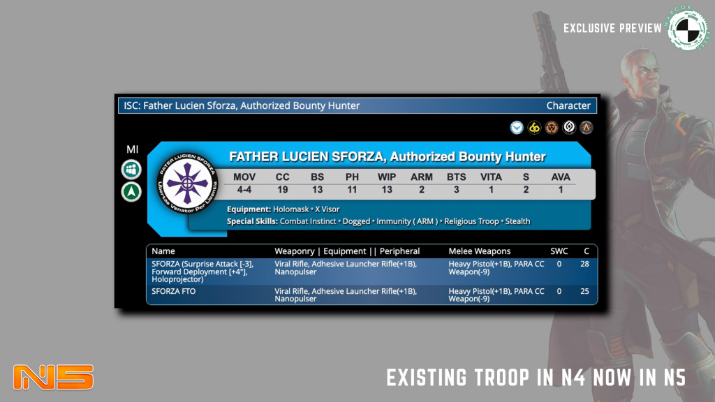 Sforza, well known as a useful-but-not-competitively-common profile, was always a good example of a common character archetype, a middleweight unit with some cool situational abilities, handy with a rifle but not a real gunfighting choice. His core loadout changed slightly but meaningfully, gaining Immunity (ARM), which is useful on a Dogged model, as well as Combat Instinct, and effectively gaining Burst 3 Adhesive ammunition by swapping the old style adhesive launcher for the new rifle version. These are all little nudges that make him a bit more attractive while filling a similar role. What we like as design is his split into two profiles - an FTO version (he is confirmed as being in Tunguska, Dashat, Operations Subsection and Imperial Service) for 25pts and a Holoprojector version with Forward Deployment +4” for 28pts. This is neat because those rules give a valid way to use him even if you can’t incorporate him usefully into a Fireteam. Overall, a cool unit which nudges upward slightly in power, hopefully into a competitive slot.