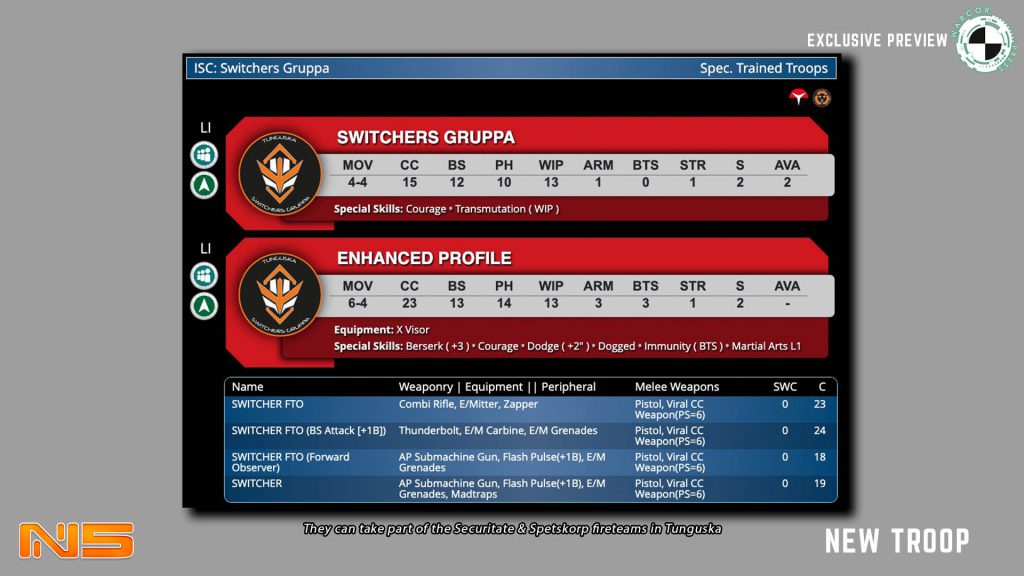 That explanation out of the way, does the Switcher look any good? Its weird Transmutation mechanic certainly keeps it cheap relative to the amount of stats and special kit it gets. There’s certainly some scope to do damage as a fast-moving CC model with Berserk and Dogged. It can combine that with either being a specialist, or having some much more useful weapons, with the 24pt profile boasting a Burst 3 long-range, and Burst 3 E/M weapon. With BS13 those are worth using in a Fireteam. Overall this seems like a toolbox unit, but not straightforward to get maximum value out of. It’s OK at gunfighting in some circumstances; it’s dangerous in melee but is quite expensive to trade with Berserk, and won’t beat a more skilled Martial Arts model.